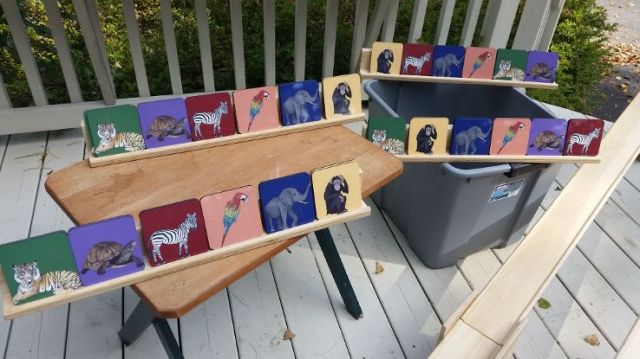 I am especially proud of the animal matching game that Helen recently re-designed, and made much more durable- she had the great idea to have them made into coasters (waterproof and long lasting) so they can stand up to lots of tiny hands!