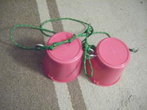 7. Measure a length of rope that will be long enough to tie to the eyehooks and long enough for the children to hold the bucket stilt hand without stooping.